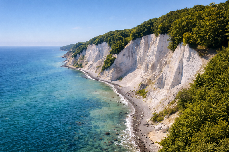 Diese gewaltigen Klippen erstrecken sich über mehrere Kilometer entlang der Insel Møn, wo Wälder auf das Meer treffen und das Wasser zwischen tiefem Blau und Türkis wechselt.
