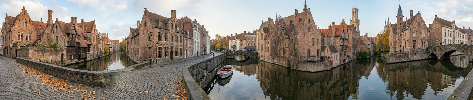 The historic centre of Bruges is often called the “Venice of the North.” Narrow canals weave through a medieval cityscape of brick houses, church towers, and stone bridges. Horse-drawn carriages pass through cobbled streets, and reflections shimmer across the water.