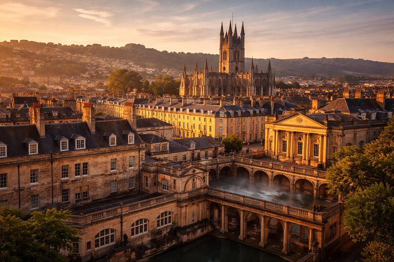 Bath ofrece una forma distinta de belleza, basada en la estructura. Su arquitectura georgiana sigue un orden visual claro, donde la proporción y la simetría generan una sensación de coherencia en toda la ciudad. La piedra de tonos cálidos le otorga una identidad uniforme y refinada.
